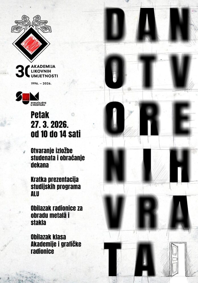 Akademija likovnih umjetnosti Sveučilišta u Mostaru na Širokom Brijegu održat će Dan otvorenih vrata 27. ožujka s programom koji počinje u 10 sati u Sveučilišnoj galeriji Akademije likovnih umjetnosti i traje do 14 sati. Akademija će biti otvorena za posjete do 16 sati. Ovaj događaj namijenjen je svima zainteresiranima, posebno onima koji razmišljaju o upisu na Akademiju likovnih umjetnosti.