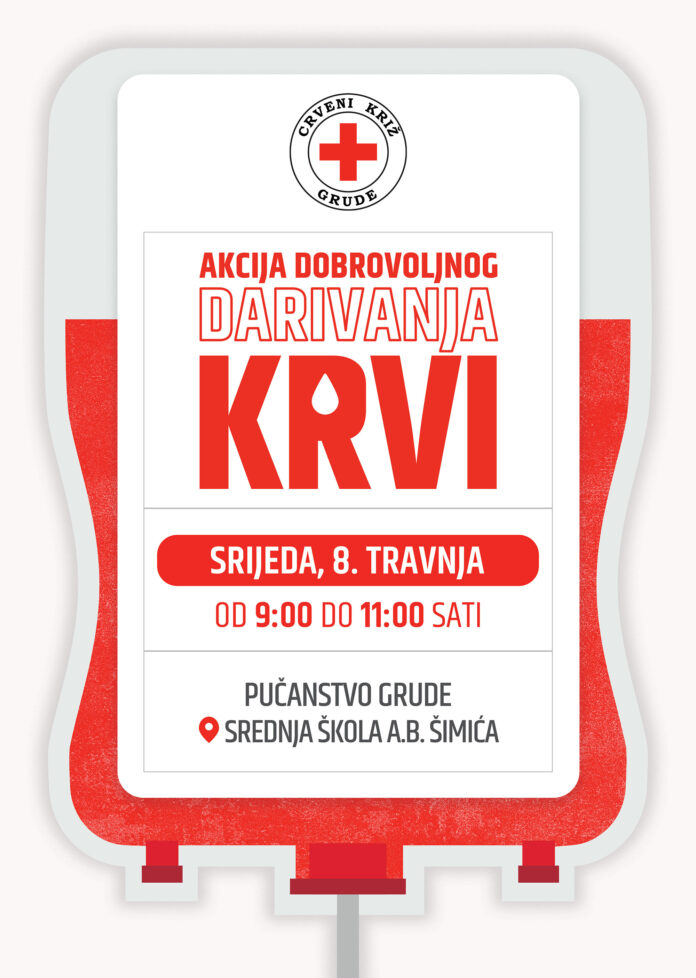 Akciju organizira Crveni križ Grude u suradnji s Transfuzijskim centrom Sveučilišne kliničke bolnice Mostar.