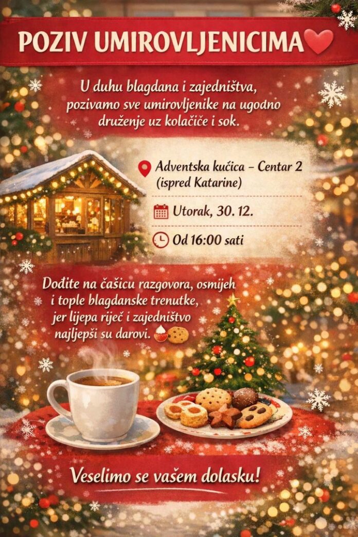 Pozivaju se svi umirovljenici koji su u mogućnosti da se ovog utorka, 30. prosinca, s početkom u 16 sati, pridruže ovom toplom susretu ispunjenom blagdanskim duhom, ljudskošću i radošću dijeljenja.