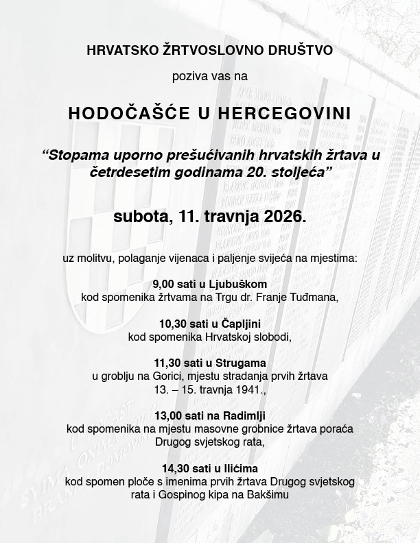 Hrvatsko žrtvoslovno društvo iz Zagreba organizira tradicionalno hodočašće pod nazivom “Stopama uporno prešućivanih hrvatskih žrtava u četrdesetim godinama 20. stoljeća” u subotu 11. travnja 2026. godine.
