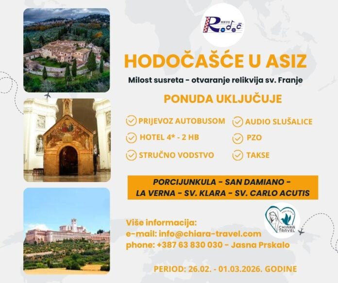 HKUD „Rodoč“, u suradnji s agencijom Chiara Travel Međugorje, organizira hodočašće u Asiz, grad sv. Franje Asiškog, koje će se održati od 26. veljače do 1. ožujka 2026. godine. Ovo hodočašće nastalo je kao inicijativa HKUD-a „Rodoč“ s ciljem približavanja franjevačke duhovnosti vjernicima kroz molitvu, zajedništvo i boravak na mjestima duboke duhovne i povijesne važnosti.