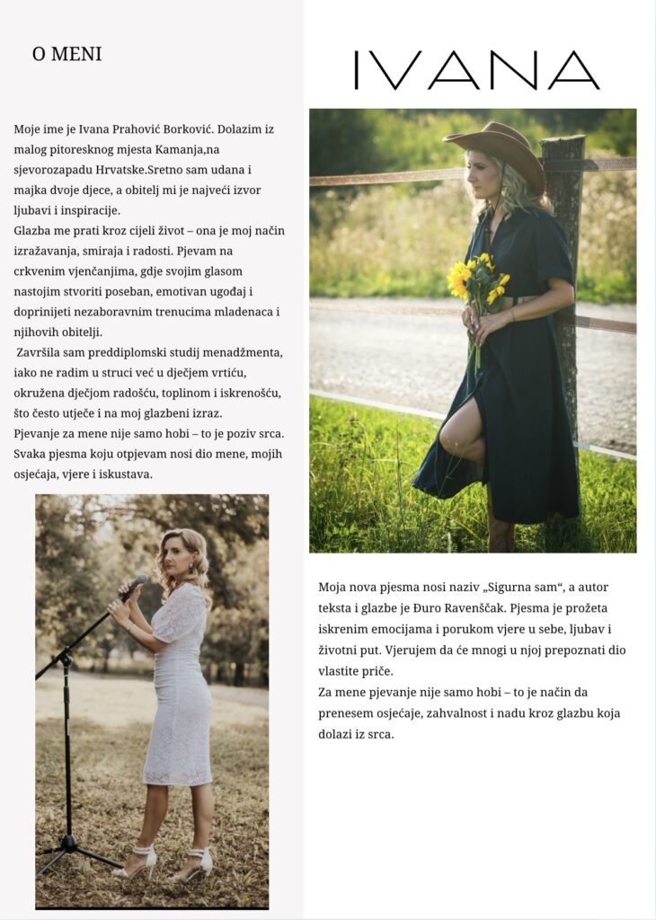 Nova pop balada “Sigurna sam” pjevačice Ivane Prahović Borković, poznate pod umjetničkim imenom IVANA, donosi iskrenu priču o ljubavi, povjerenju i unutarnjoj sigurnosti žene koja staje pred oltar. Pjesma, prožeta duhovnošću i nježnošću, već je osvojila mnoge slušatelje, a njezin videospot dostupan je na YouTubeu.