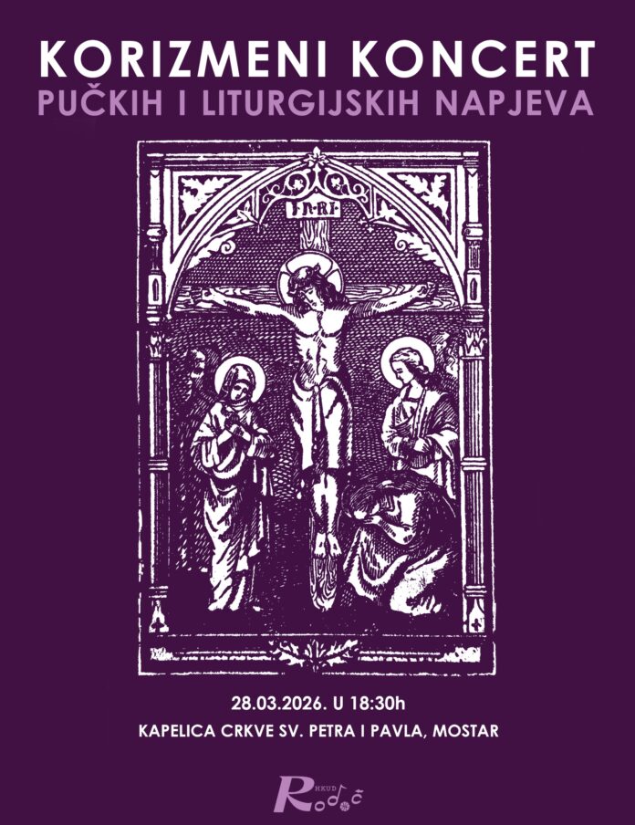 Korizmeni koncert pučkih i liturgijskih napjeva, će se održati u subotu, 28. ožujka 2026. godine u 18:30 sati u kapelici Crkve sv. Petra i Pavla u Mostaru.