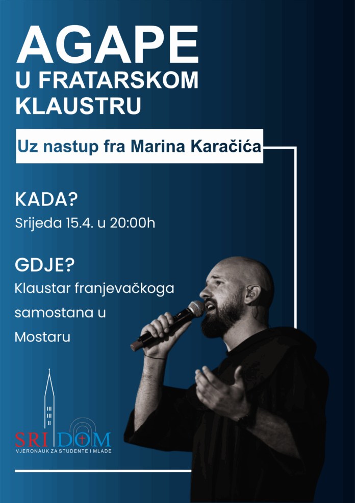 U srijedu 15. travnja je novi vjeronauk za studente i mlade u Mostaru. Susreti se će biti posebnog karaktera jer će biti u klaustru franjevačkog samostana. U klaustru će biti glazbeni nastup fra Marina Karačića. Uz fra Marinove pjesme mladi će se družiti s fratrima i uz „slatki“ stol imati besplatnu tombolu.