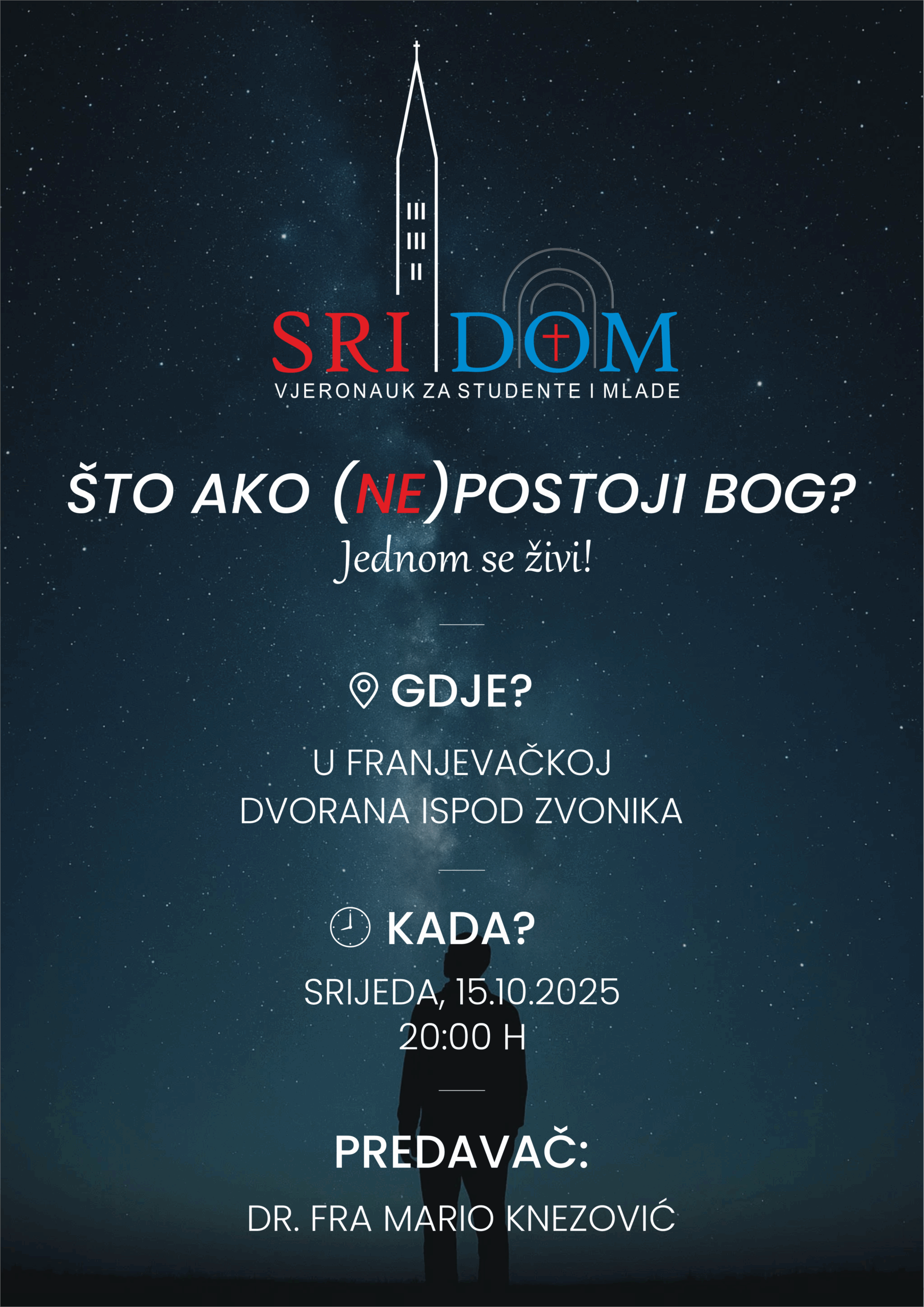 U srijedu 15. listopada počinje vjeronauk (tribine) za studente i mlade. Vjeronauk će biti u velikoj dvorani ispod zvonika u Franjevačkoj.