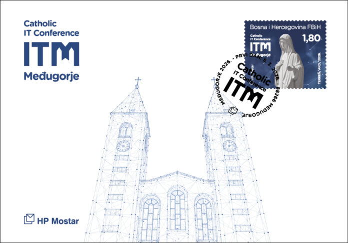 Prva marka Hrvatske pošte (HP) Mostar tiskana je 12. svibnja 1993. godine na temu „Sakralni spomenici Herceg-Bosne – Međugorje“, a izdavanje maraka posvećenih Međugorju nastavilo se i tijekom sljedećih godina. Na markama su prikazani različiti motivi – Kraljica Mira, crkva sv. Jakova, Križevac, Mladifest … Ovogodišnje izdanje prati otvaranje treće Katoličke IT konferencije na temu „Spoj tehnologije i duhovnosti u Međugorju“, koju organizira Informativni centar Mir Međugorje. Autor marke je Zdravko Terkeš, prvi dan izdanja 5. ožujka 2026., a nominalna vrijednost 1,80 KM.