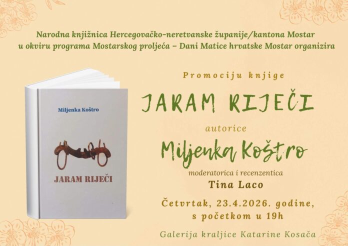 Narodna knjižnica Hercegovačko-neretvanske županije u okviru Dana Matice hrvatske Mostar organizira promociju knjige “Jaram riječi” autorice Miljenke Koštro.