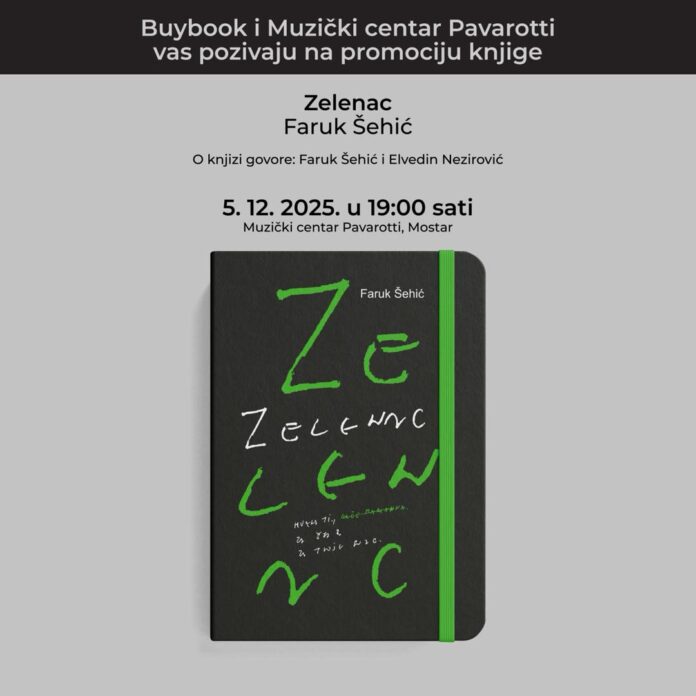Promocija knjige „Zelenac“ održat će se u Muzičkom centru Pavarotti u petak, 5. prosinca 2025., s početkom u 19:00 sati. Uz autora, knjigu će predstaviti i pisac Elvedin Nezirović.