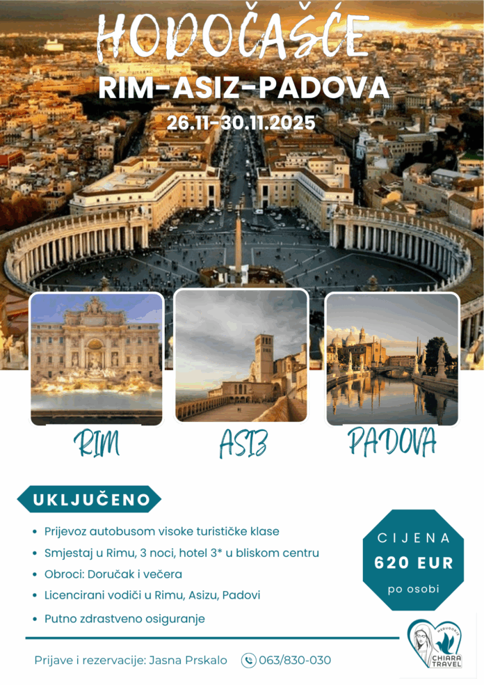 U vremenu kada nam je svima potreban trenutak mira, tišine i duhovne obnove, pozivamo vas na posebno duhovno putovanje, hodočašće svetim tragovima vjere kroz Asiz, Rim i Padovu, od 26. do 30. studenog 2025. godine.