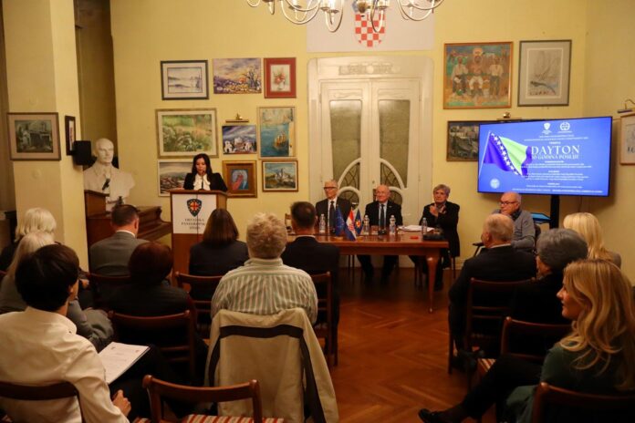 Hrvatska paneuropska unija i Internacionalna akademija nauka i umjetnosti u Bosni i Hercegovini održale su sinoć u Zagrebu tribinu pod nazivom „Dayton – 30 godina poslije“, na kojoj su sudionici iz Hrvatske i Bosne i Hercegovine analizirali dosege, izazove i budućnost Daytonskog mirovnog sporazuma te njegove implikacije za regionalnu stabilnost i europsku perspektivu Bosne i Hercegovine.