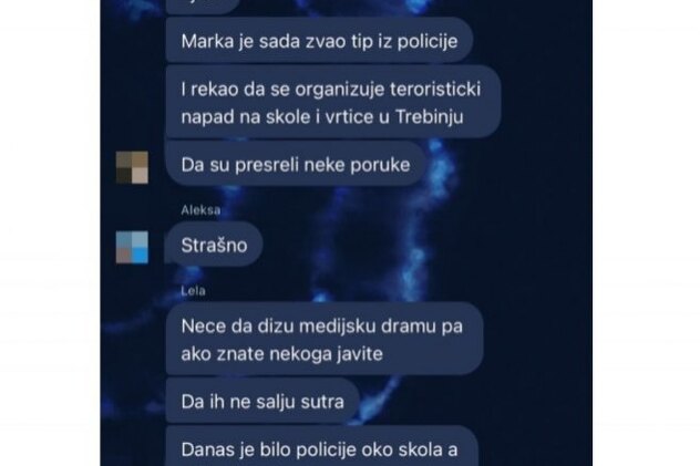 “Marka je sada zvao tip iz policije i rekao da se organizuje teroristički napad na škole i vrtiće u Trebinju. Da su presreli neke poruke”, piše u jednoj Viber grupi i također se navodi da su jučer bile jake policijske snage kod trebinjskih škola.