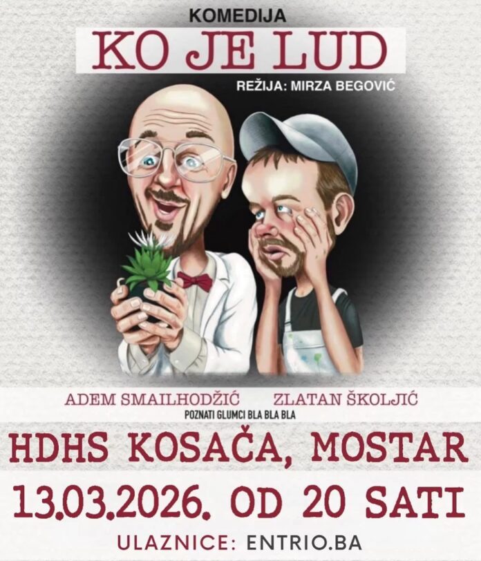 U petak, 13. ožujka 2026. godine, s početkom u 20:00 sati, u Hrvatskom domu Herceg Stjepan Kosača u Mostaru bit će izvedena hit komedija „Ko je lud“, u režiji Mirze Begovića. U glavnim ulogama nastupaju Adem Smailhodžić i Zlatan Školjić.