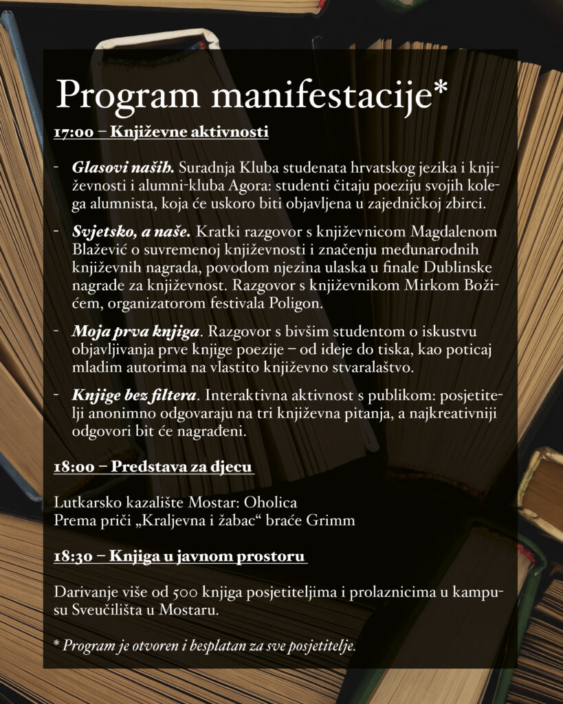 Povodom obilježavanja Svjetskog dana knjige i autorskih prava, Sveučilište u Mostaru u suradnji s Lutkarskim kazalištem Mostar organizira prigodan društveno-kulturni program namijenjen studentima, djeci, obiteljima i svim građanima Mostara. Program će se održati u četvrtak, 23. travnja, s početkom u 17:00 sati u vanjskom amfiteatru kampusa Sveučilišta u Mostaru.