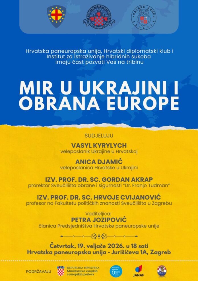 Hrvatska paneuropska unija, Hrvatski diplomatski klub i Institut za istraživanje hibridnih sukoba organiziraju tribinu pod nazivom „Mir u Ukrajini i obrana Europe“, koja će se održati u četvrtak, 19. veljače 2026. u 18 sati u prostorijama Hrvatske paneuropske unije, Jurišićeva 1/I, Zagreb.